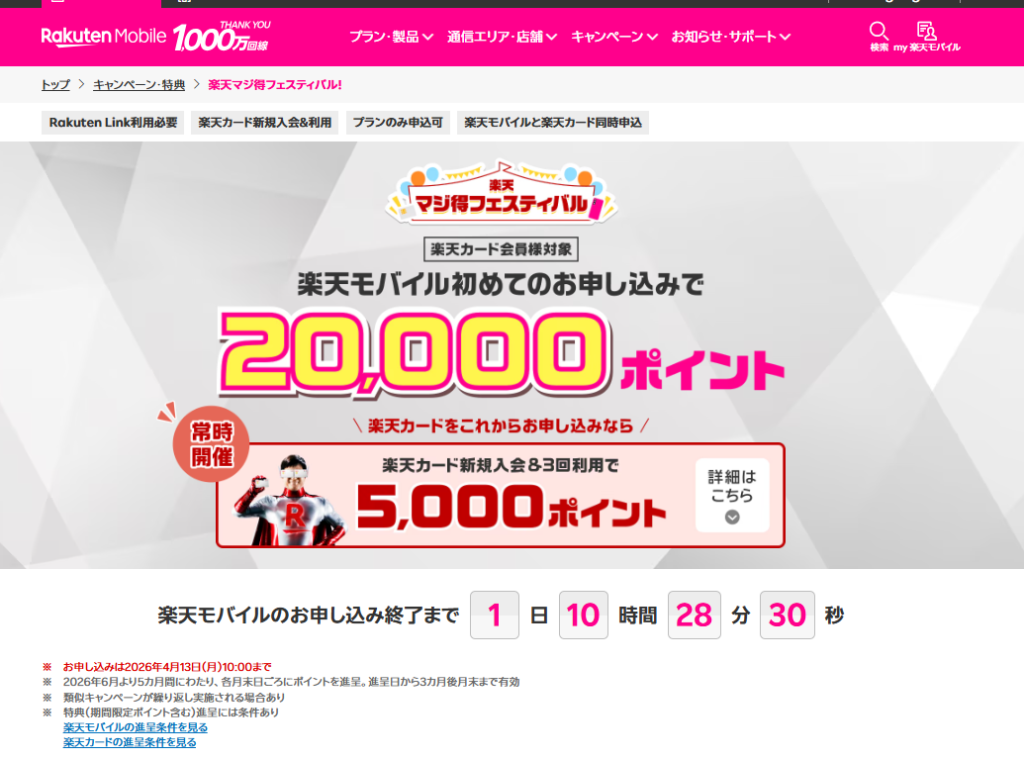 内容:新規でも電話番号そのまま乗り換えでも初めて楽天モバイルお申込みで20,000ポイント (ポイントは分割で進呈、期間限定ポイント、Rakuten Link 利用の条件あり)