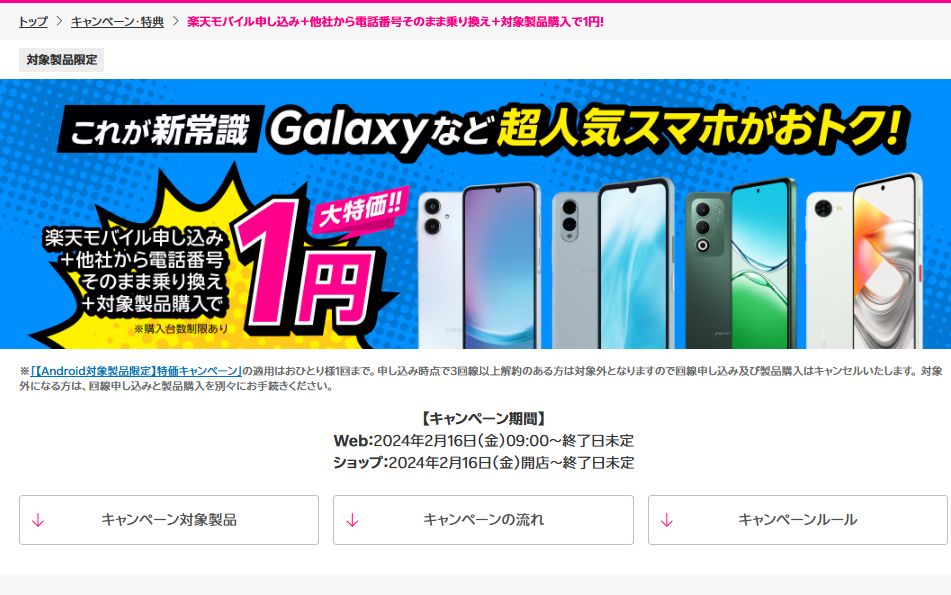 現在以下が楽天モバイル申し込み+他社から乗り換えで製品価格1円で購入可能