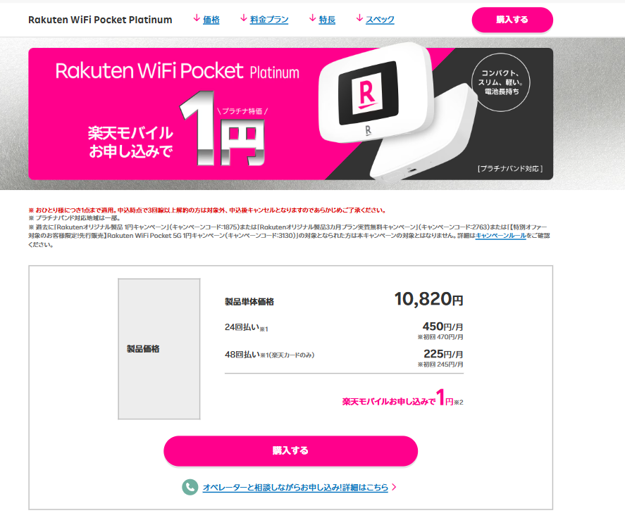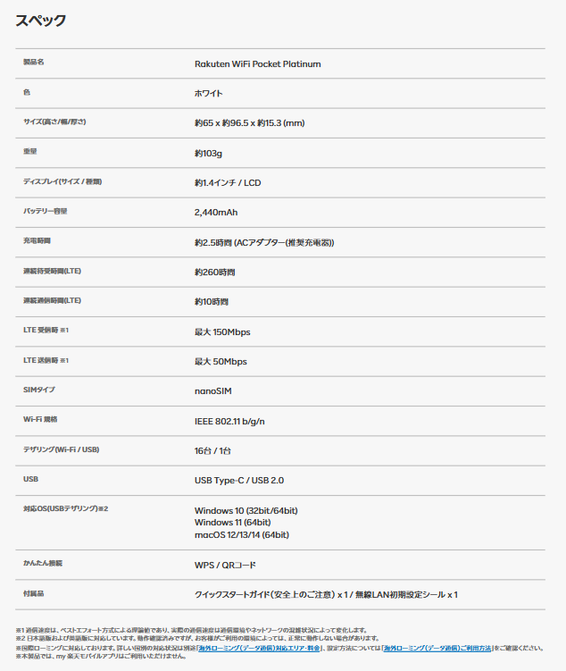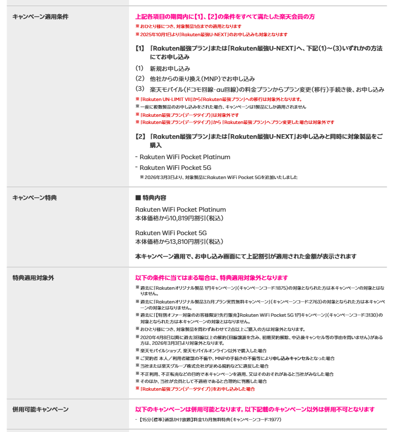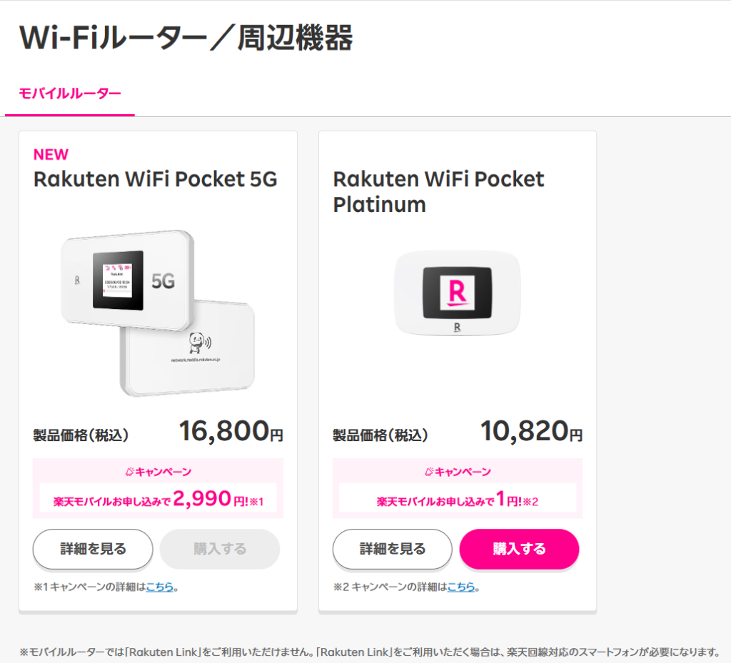 以前はRakuten WiFi Pocket Platinumのみが対象でしたが、現在は5Gに対応したRakuten WiFi Pocket 5Gが追加されました。