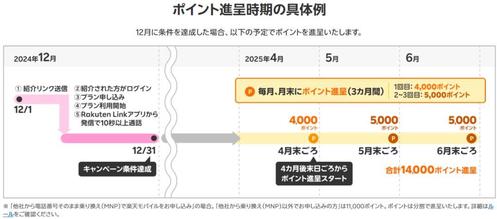 12月にお申込みされた場合、4月に4,000ポイント、5月に5,000ポイント、6月に5,000ポイントと分けて進呈されます。