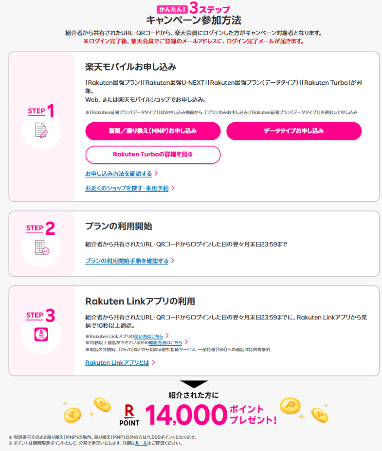 2026年3月2日(月)9:00以降にお申し込みの方は、紹介リンクからクリックして楽天IDでログイン(紹介ログイン)した日の翌々月末日23:59までに、「Rakuten最強プラン」「Rakuten最強U-NEXT」をお申し込みした回線でRakuten Linkを用いた発信で10秒以上の通話が必要になりました。