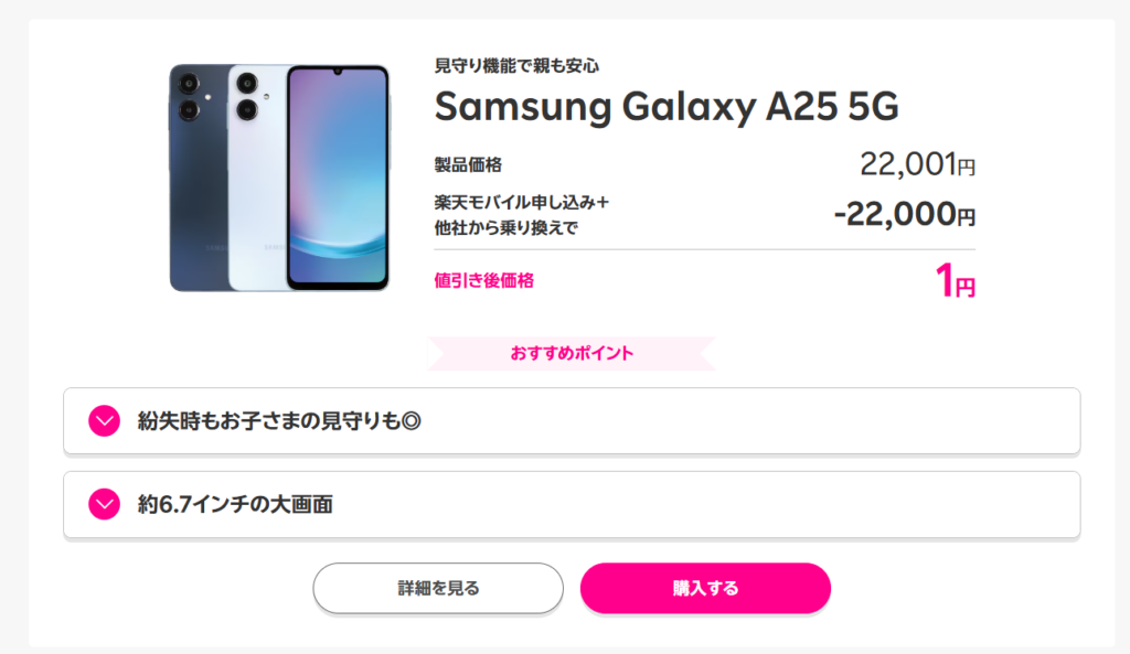 例えば、現在(2026/4/12)の対象製品であるSamsung Galaxy A25 5Gだと以下のような形です。