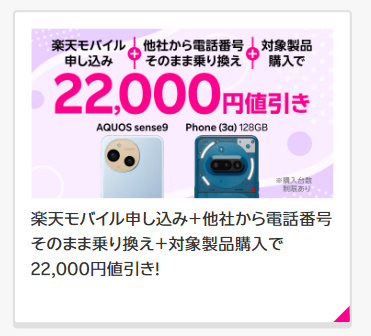 以下が楽天モバイル申し込み+他社から乗り換えで製品価格22,000円割引で購入可能